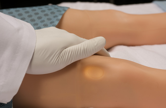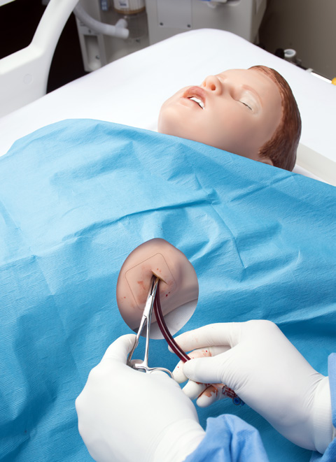 - Введення дренажної трубки: дренування по середньо-пахвовій лінії при гемотораксі, кісткові орієнтири, що пальпуються, реалістична шкіра з можливістю розрізу та ушивання, специфічний звук при проколі плеври та виділення рідини
